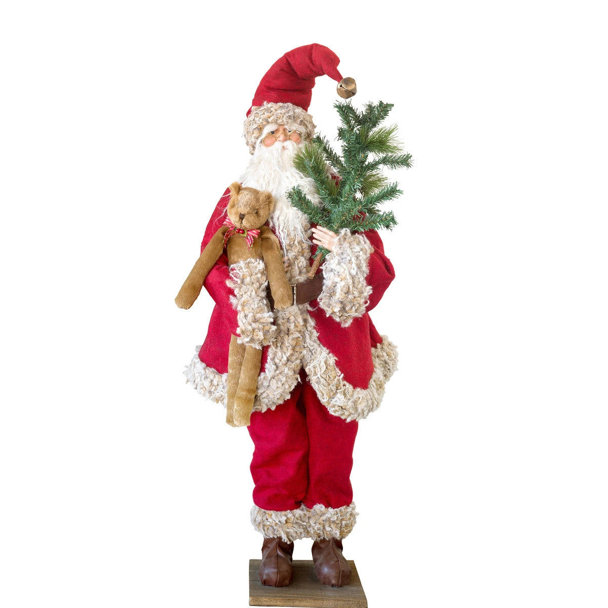 A sweet reminder that simple gifts often mean the most, this cheerful Santa holds a stuffed teddy bear and small Christmas tree.