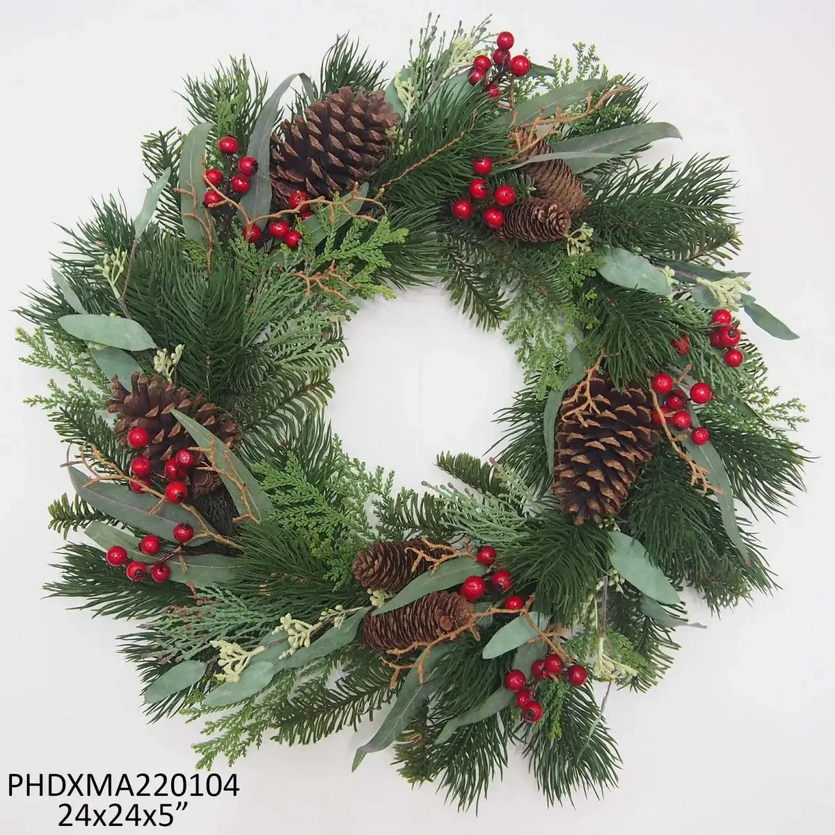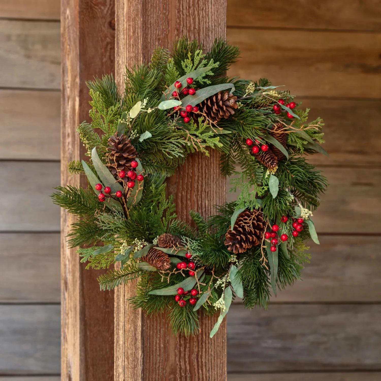 Our Christmas Gathering Wreath has everything. Mixed faux evergreens, red berries and pine cones make up this fresh looking faux wreath.