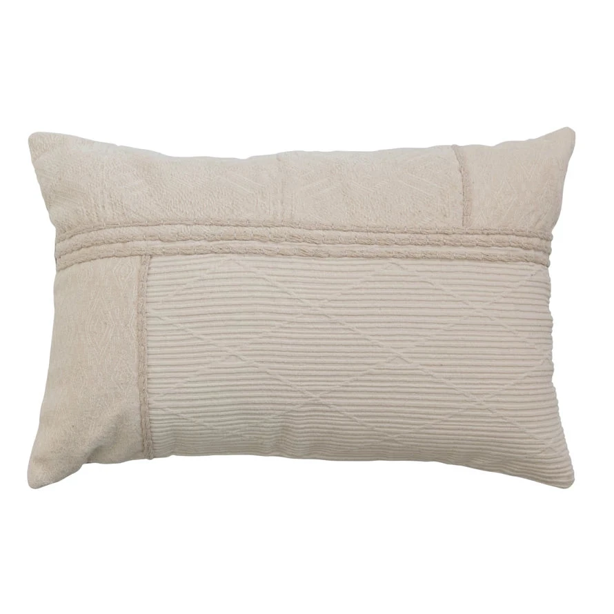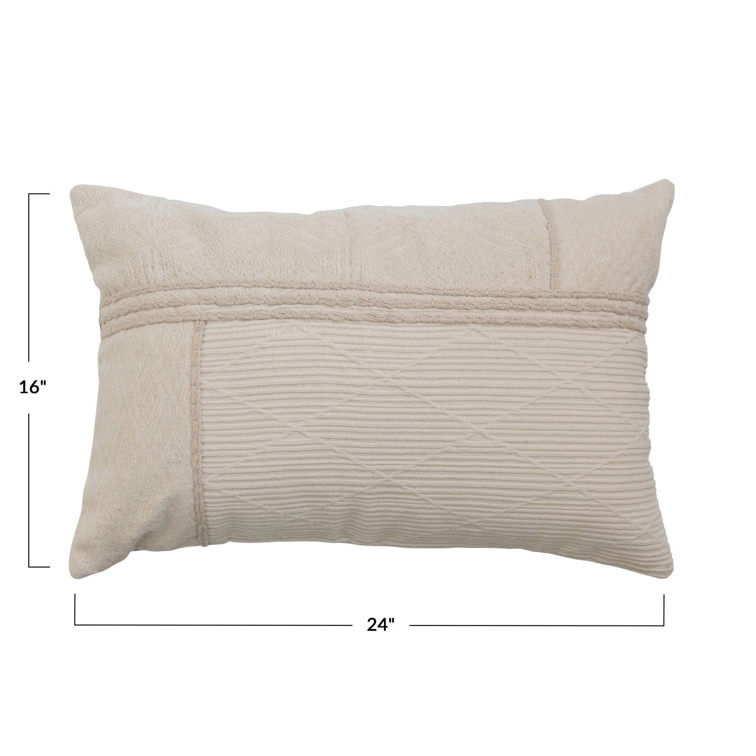 Cotton Lumbar Pillow With Rope Embroidery & Chambray Back, Natural