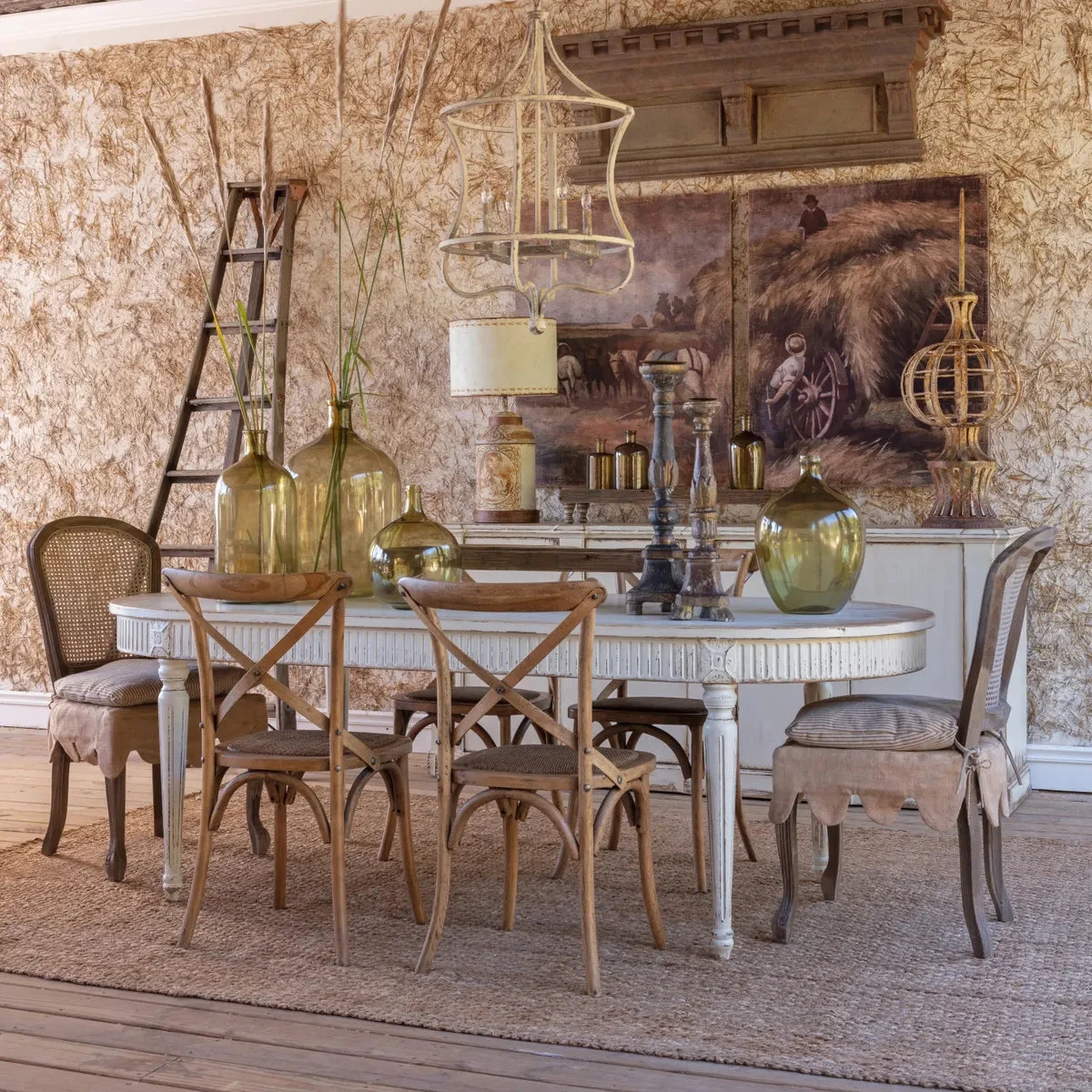 For that more formal French Country decor our Grand Dining table in distressed white has a beautiful finish and seats up to eight. Look closely at all the details of this solid oak table.