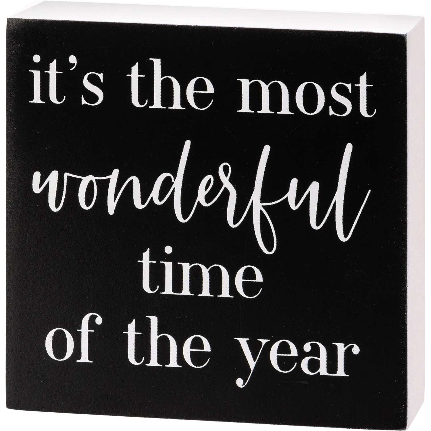 A black wooden block sign featuring “It’s The Most Wonderful Time Of The Year” sentiment. Easy to hang slot or can free-stand alone.