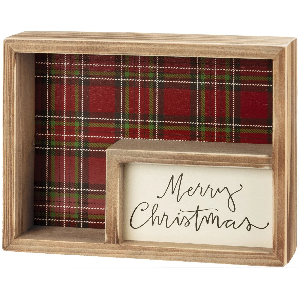 A double-inset box sign featuring a holiday plaid pattern on the background and a front panel with a hand lettered “Merry Christmas” sentiment. Easy to hang or can free-stand alone.
