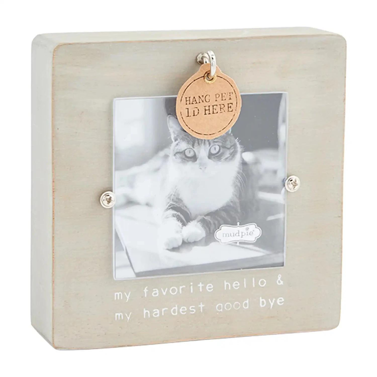 Keep your pet forever in your heart with this gray pet memorial picture frame. The gray wooden block frame features the printed sentiment – “my favorite hello & my hardest good bye”. The frame features a metal hook to display pet’s I.D. tag.
