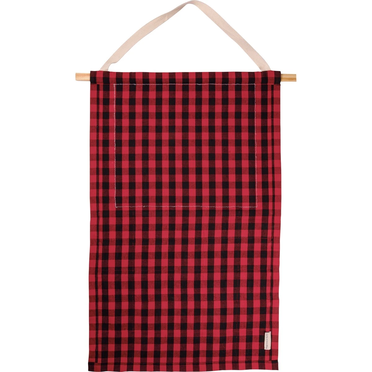 A cotton hanging wall countdown featuring a jolly Santa design, embroidered numbered pockets, and a red and black gingham background pattern. Santa design is replicated from original artwork painted onto burlap canvas, giving the art a unique depth and texture. Countdown is attached to wooden rod and hangs from attached cotton tape loop.