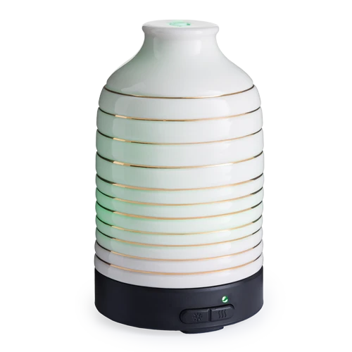 The Serenity Essential Oil Diffuser has an ivory ceramic sleeve with metallic gold bands and sits on a black base.