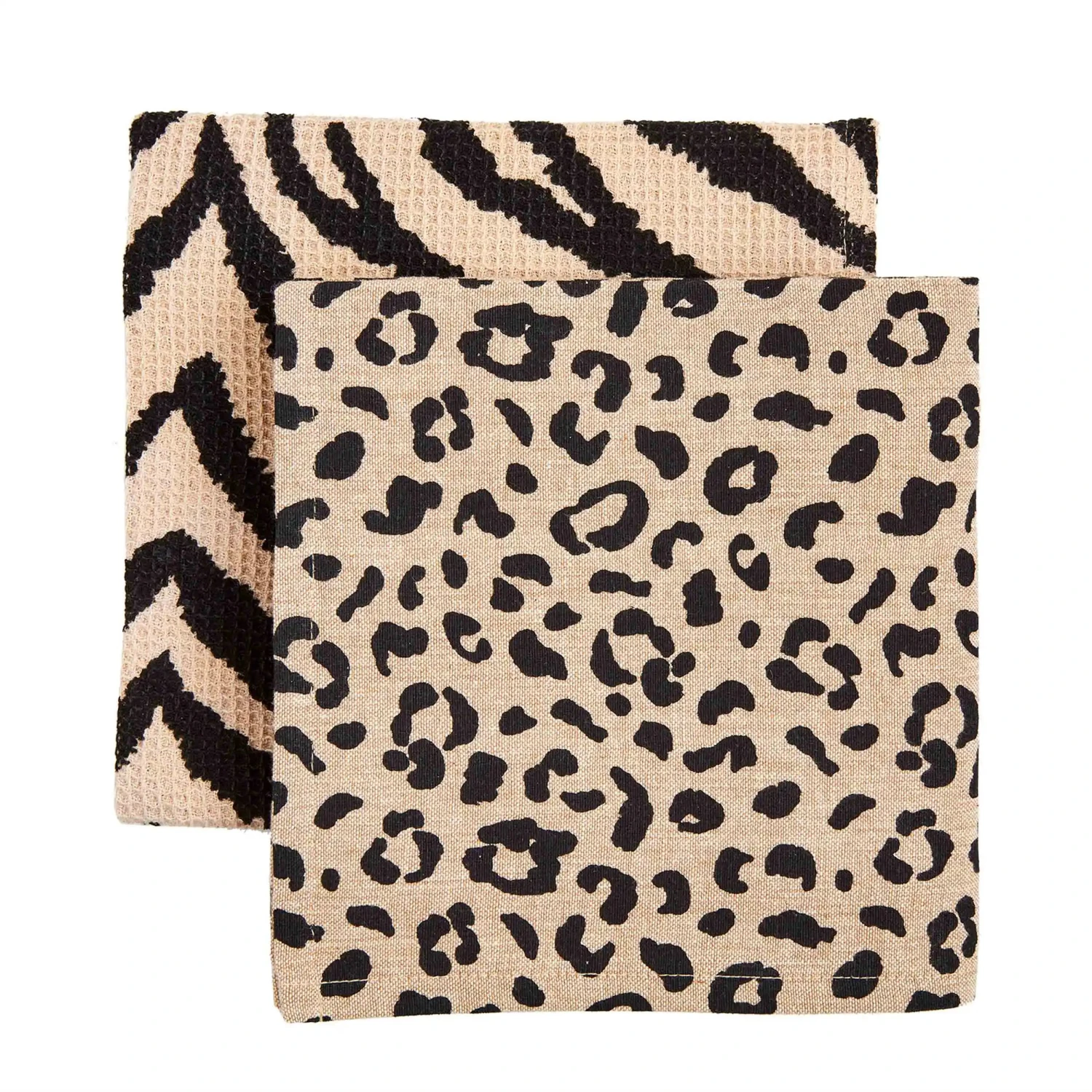 Introducing a fresh designer look for Spring – this Zebra Kitchen Towel Set. The set comes with two cotton and waffle weave towels. One towel features a tan and black zebra pattern. The other towel features a black and tan leopard print pattern. The towels can be machine washed on cold.